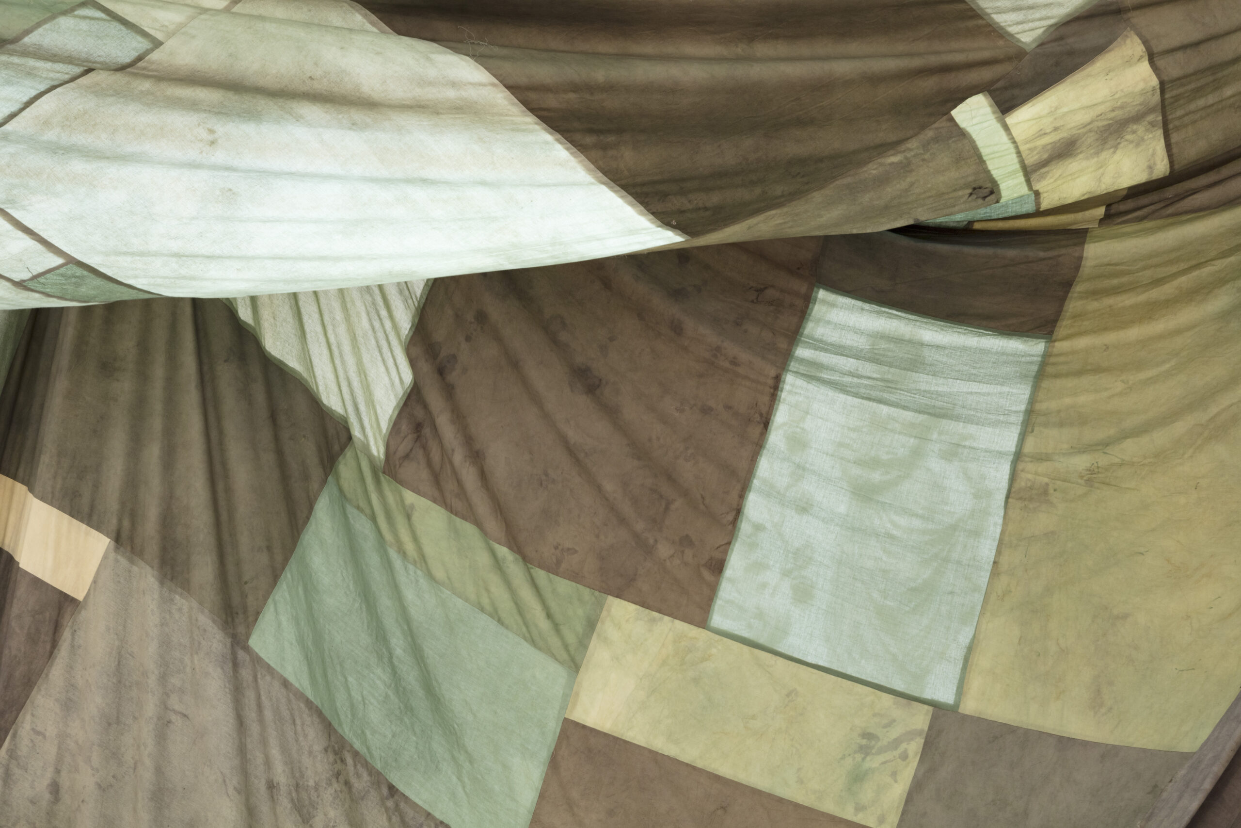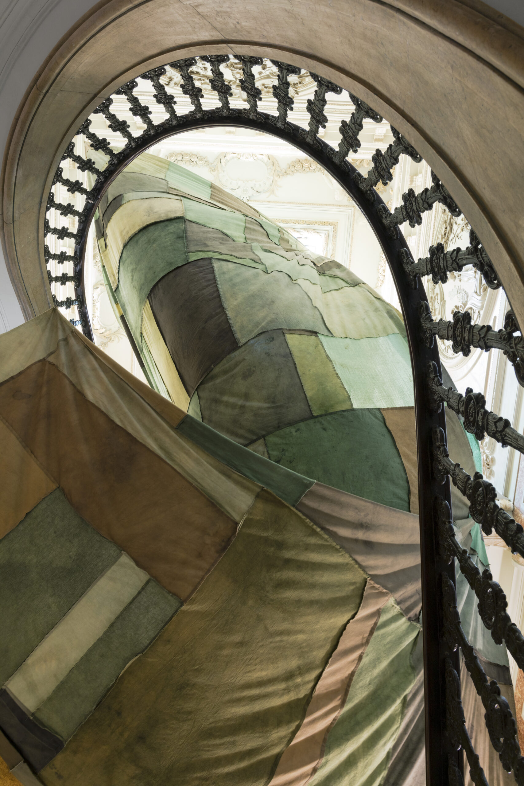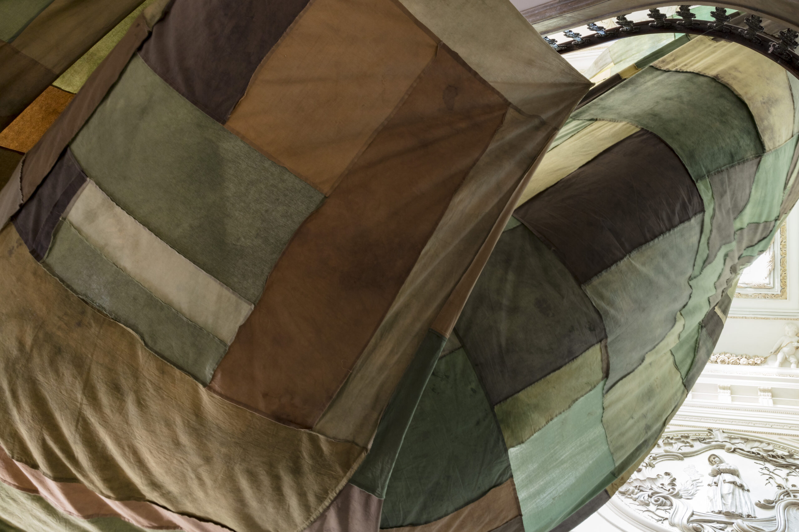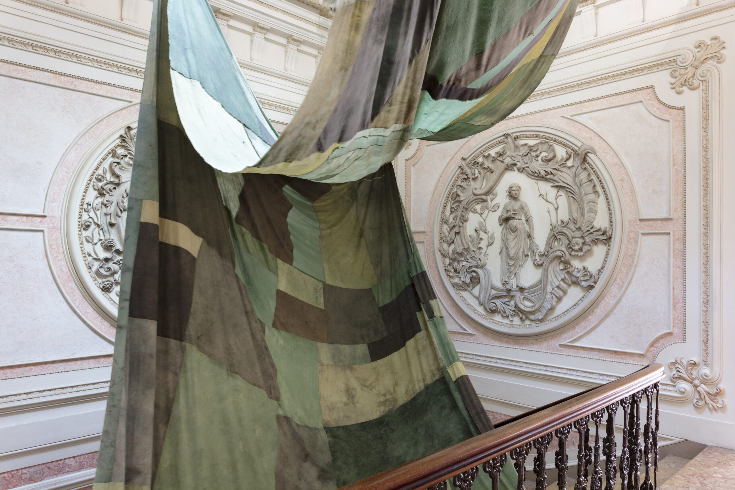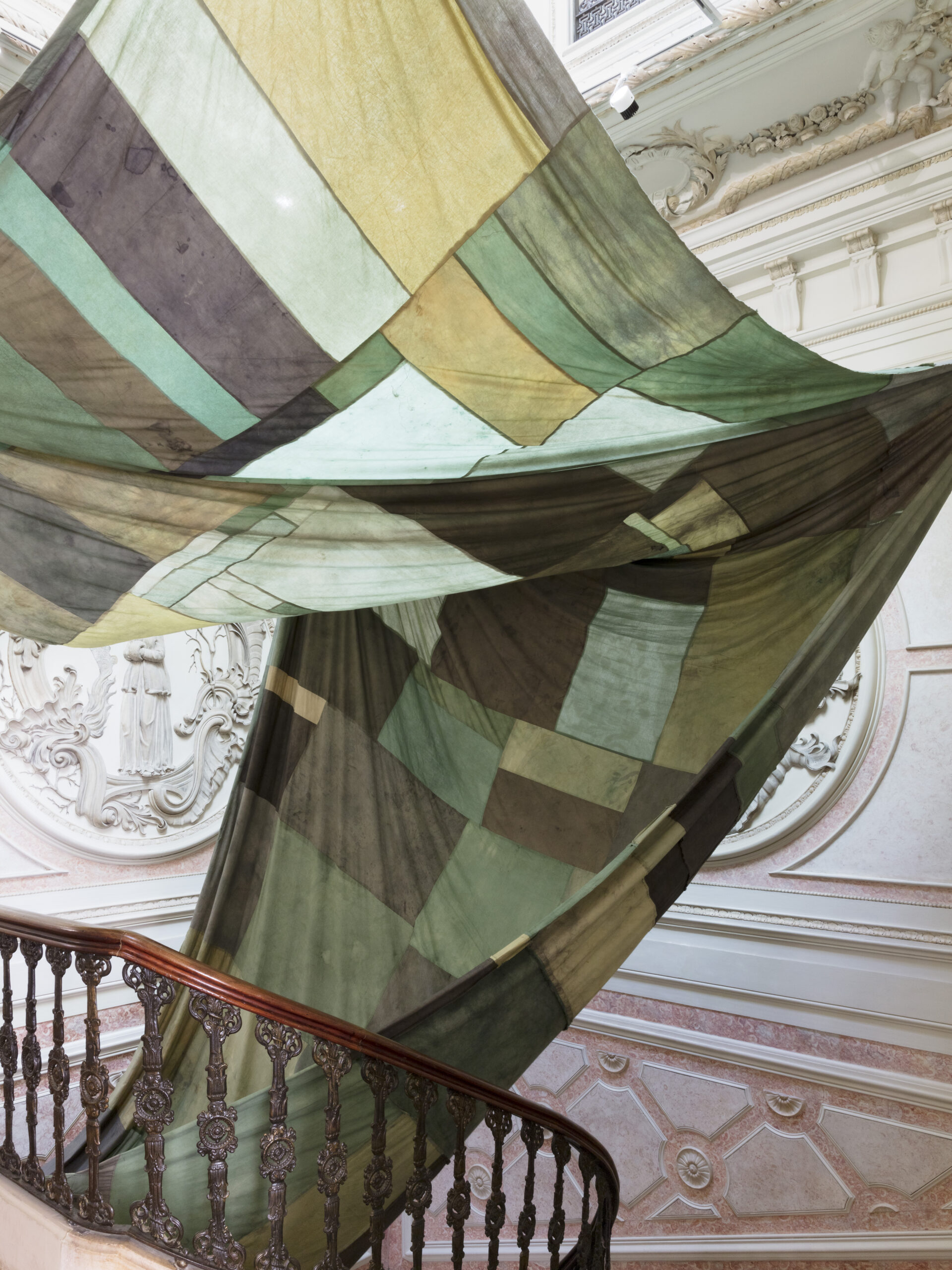 (...) The intervention celebrates the importance of dialogue, grounded in a collaborative process, and unfolds around an imaginary of textile and dyeing cultures. The installation, consisting of a single large-scale piece, explores the intersection of references, authorships, and formats, paying close attention to the material’s plasticity, as well as to the drawing and gravity that shape it."